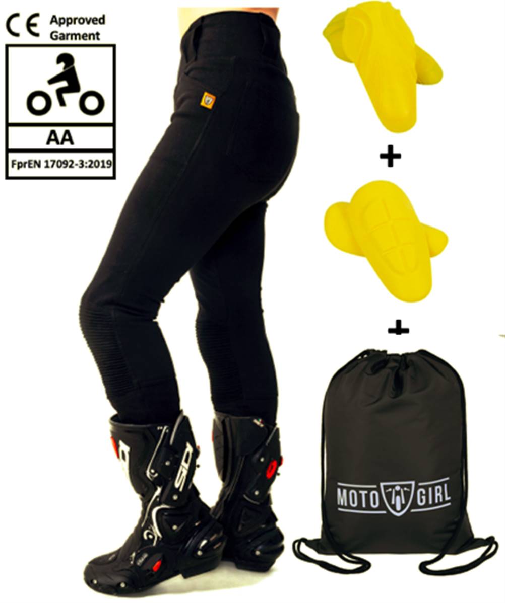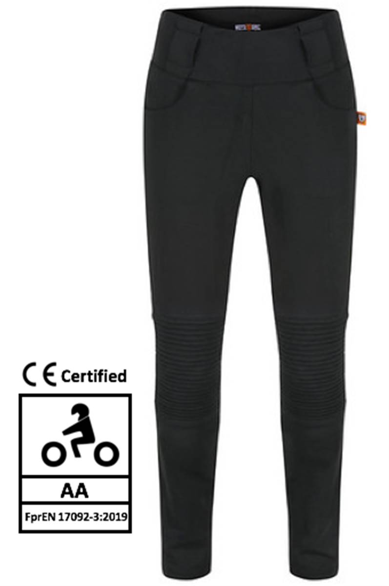 Le legging Motogirl est homologué CE  de par sa haute résistance à l'abrasion. Il est classé AA : en effet, ses protections genoux et hanches sont livrées de série et classée de niveau 2. Souples, elles sont d'une grande discrétion et d'un confort optimal. En cas de choc, la matière se durcit afin de protéger le corps au mieux. L'accès des poches de protection est aisé, et permet donc de les retirer et de les mettre au besoin.